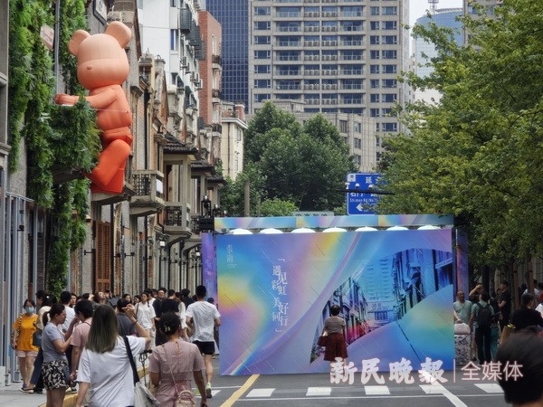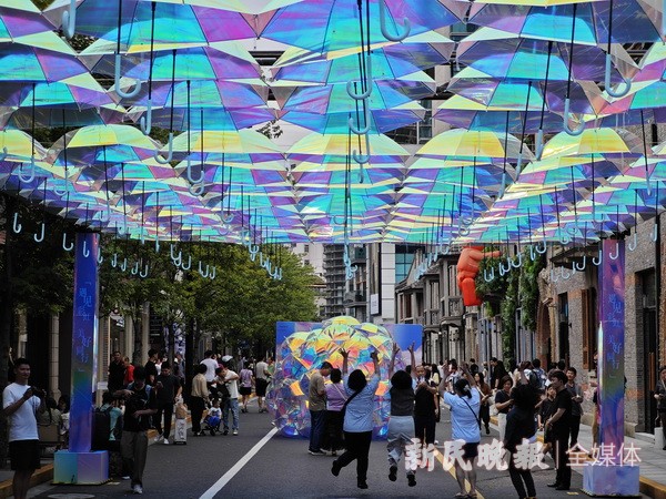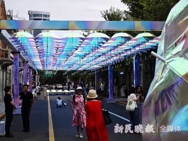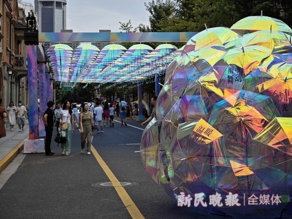 正值梅雨季,本周末茂名北路限时步行街举办“遇见彩虹,美好同行”雨伞主题展览。伞,不仅为人们遮风挡雨,也有节节向上、美满吉祥的生活寓意。本次展览以镭射伞材质折射出彩虹的光影,驱散梅雨天的阴霾,传递阳光好心情。