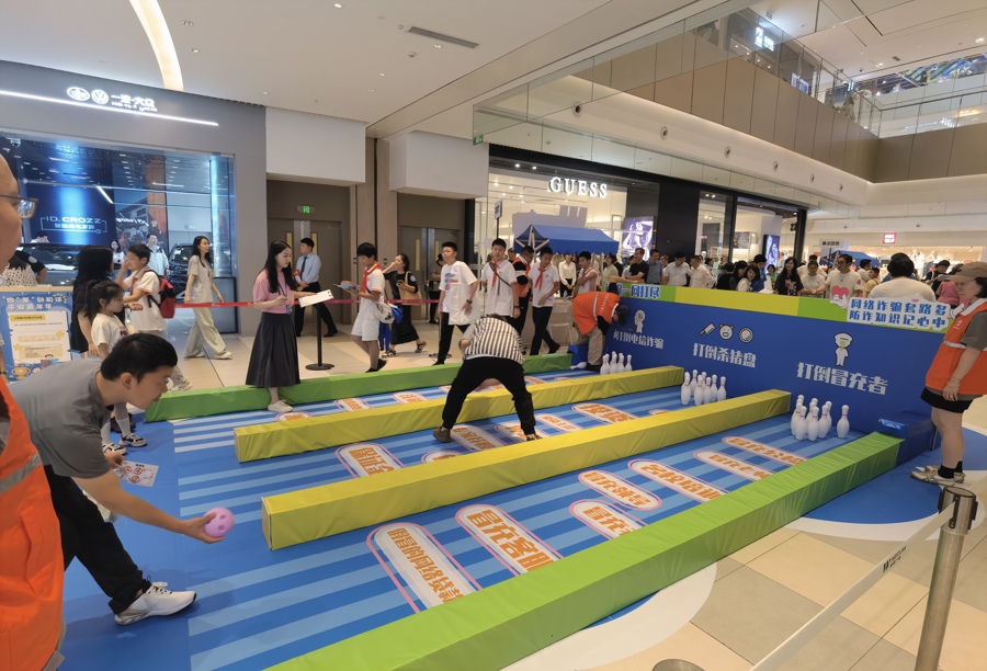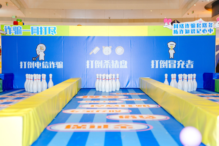 在平安客厅中,参赛队伍通过“鉴‘毒’大师”互动游戏和“击倒‘电诈’”保龄球运动,直观了解毒品和电信诈骗的危害,并提高自我防范意识。