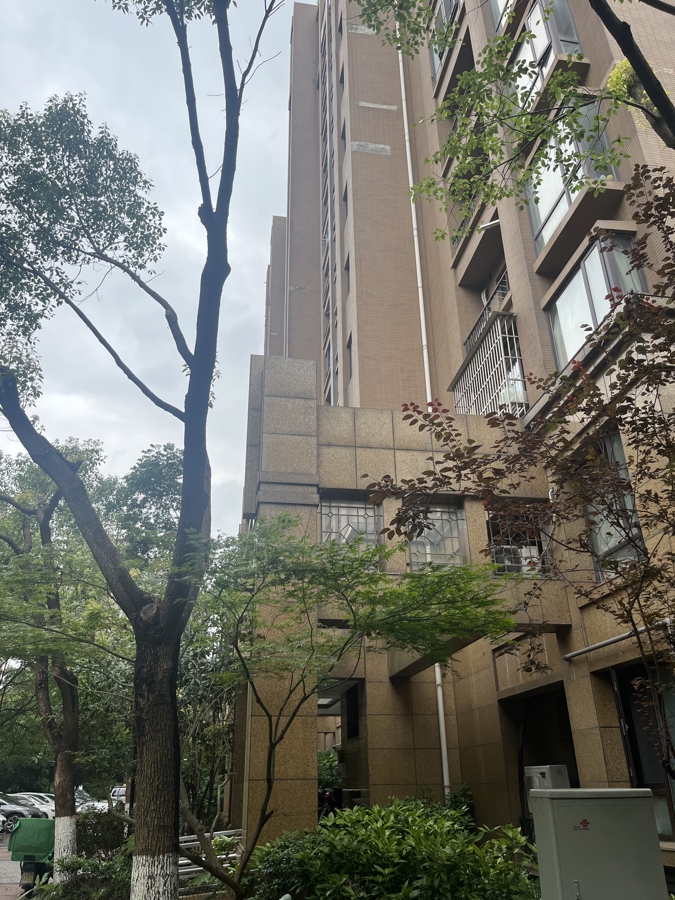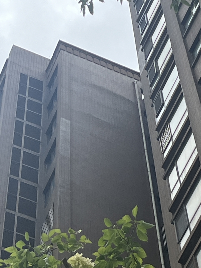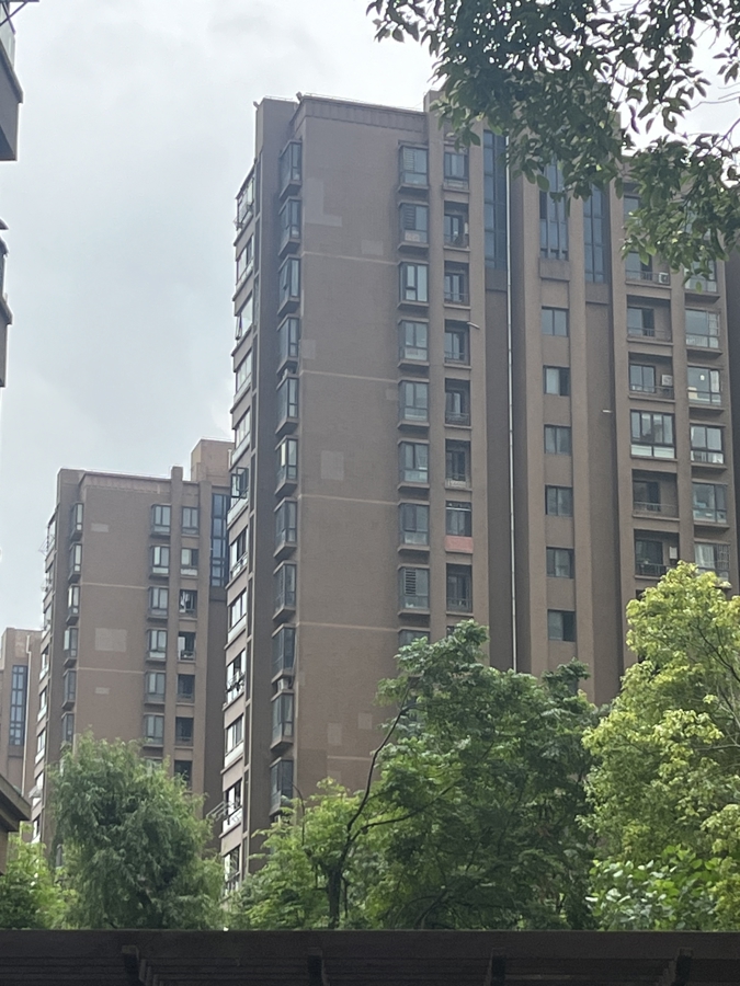 从曹安公路向南拐入黄渡·绿苑路,前往小区西门的路上,便能看到西侧几幢建筑的外墙面斑驳不已:浅咖色的外墙上,无一例外地多了几抹不规整的“补丁”,颜色深浅不一,仔细看还能看到有些地方干脆裸露出了内里的水泥色墙体。