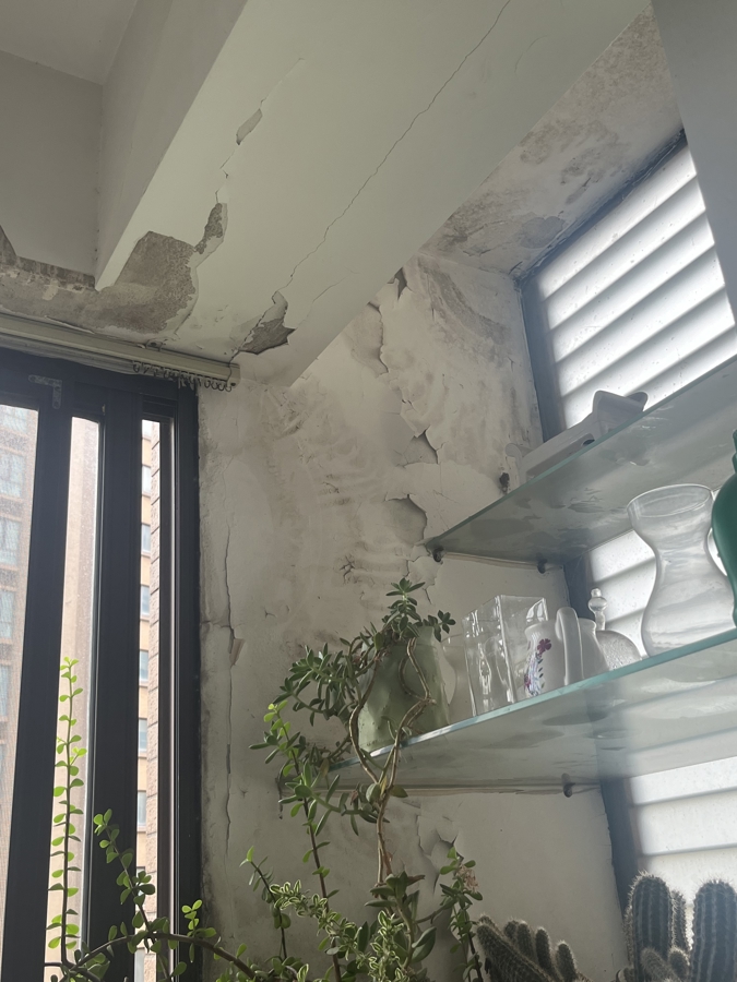 瓷砖脱落带来的附加影响——渗水漏水,同样困扰着楼内的居民。“我们统计过,楼内一共36户,出租比例大概一半,剩下的业主家里都有不同程度的漏水。”叶女士(化名)2012年搬入小区,入住后不久就发现北侧房间的阳台有渗水迹象,“当时报修后物业上门查看,做了补漏,效果有,但不明显,每年雨季都得用盆接。”大约5年前,她发现阳台区域也开始大面积漏水,去年夏季,整个阳台的墙体更是几乎被水浸湿,家里的墙面起皮、掉皮十分严重,“物业派人来看说是保温层进水了,得大修。”