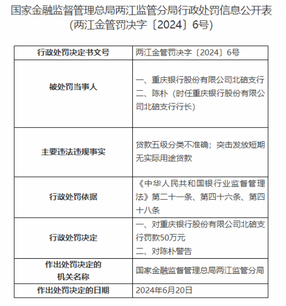 因发放短期无实用贷款等,重庆银行北碚支行被罚50万元