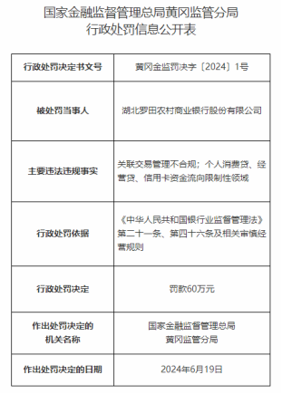 因关联交易管理不合规等,湖北罗田农商行被罚60万元