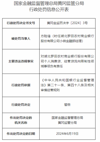 因对上述事项负有责任,对时任湖北罗田农村商业银行股份有限公司合规与风险部经理朱成刚、小微金融部经理方险锋、电子银行部经理田源分别进行警告处罚。
