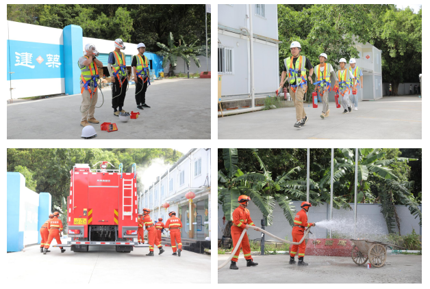 项目部成立消防应急演练指挥部,指挥部下设医疗救治组、后勤保障组、应急疏散组、通讯联络组、事故调查组五个工作小组。演练共分为现场模拟火灾疏散、初起火灾扑灭演练培训和受伤人员的紧急救治三个部分。