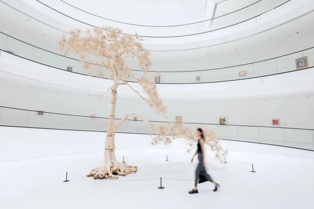 踏入展厅,高13米的纯白极简空间,中庭独占C位的装置《松》, 延绵而上的螺旋式艺术步道,宛如置身于一幅巨大艺术长卷中,缓缓展开,引人入胜。观众沿着环形观展通道一路往上,仿佛行走在时光隧道中,而身边是张大千、关良、常玉、六角彩子、田中敦子等艺术家作品,向着展厅的天光云影,在一件件作品中感受百年以来世界范围内人类在视觉艺术领域中展现的非凡创造力。