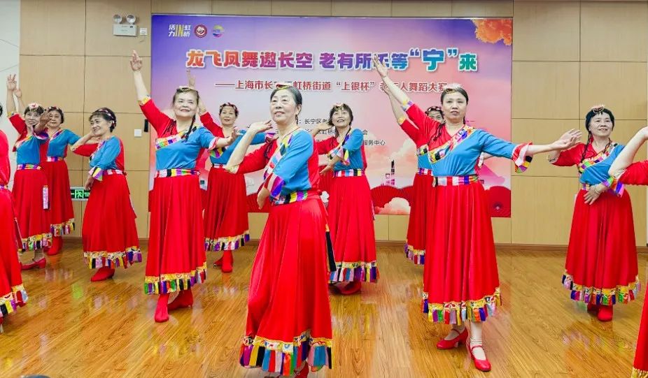 为满足辖区老年群体多样化、多层次的精神文化需求,营造良好的社区文化氛围,近日,虹桥街道在长宁区老年协会的指导下, 联合爱心企业共同举办“龙飞凤舞遨长空 老有所乐等‘宁’来”——虹桥街道老年人舞蹈大赛,9支舞蹈团队近100人参加了比赛。