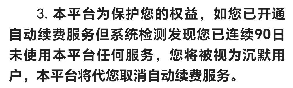 不同平台的自动续费协议也不尽相同。有文学类平台在续费协议中提到:“如您已开通自动续费服务但系统检测发现您已连续90日未使用本平台任何服务,您将被视为沉默用户,本平台将代您取消自动续费服务。”这也意味着,如果消费者本人忘记了关闭自动续费,但连续3个月未使用,自动续费服务将被取消。