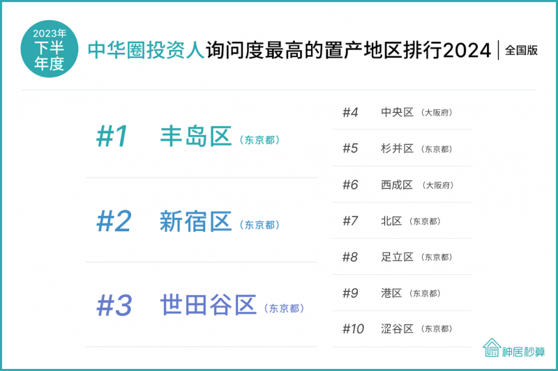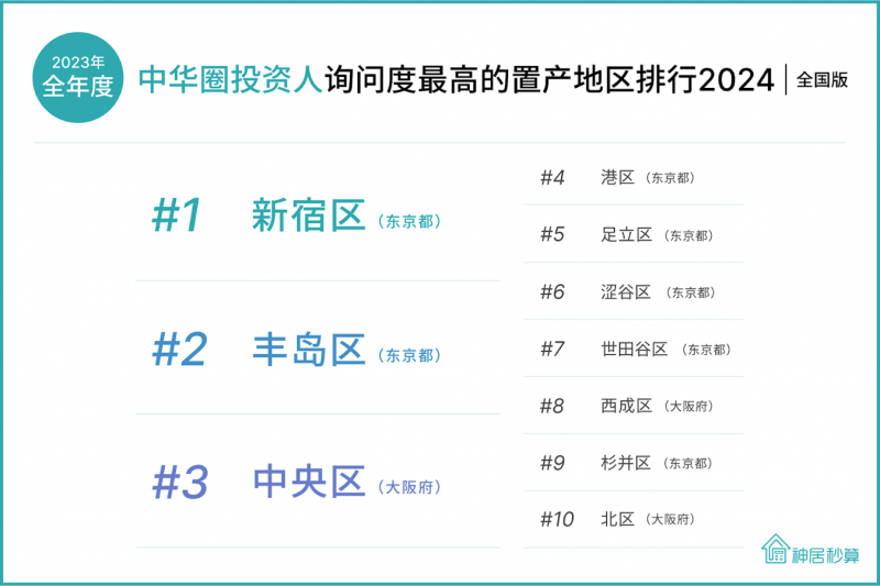 根据咨询数量统计,2023年全年度的咨询度排行,询问度最高的三个地区分别如下,第一名:东京都新宿区、第二名:东京都丰岛区、第三名:大阪府大阪市中央区。