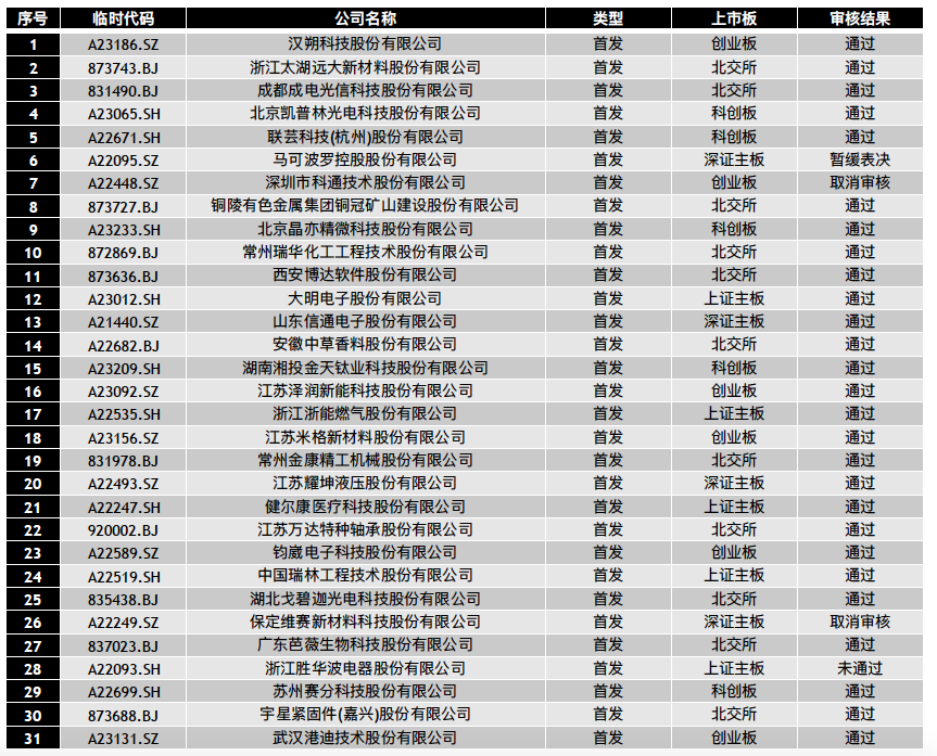 澎湃新闻梳理Wind数据显示,今年上半年共有31家企业上会审核,其中2家在上会前取消审核,27家企业获得通过,1家暂缓表决,1家企业未通过。