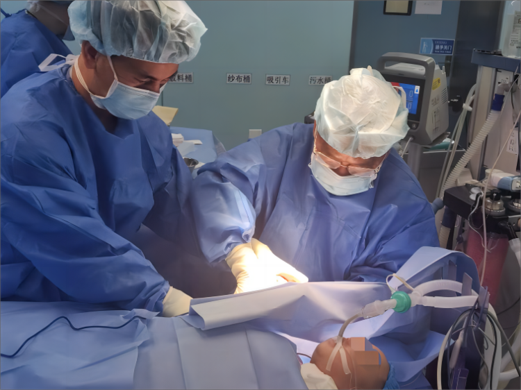 静脉通道的建立是麻醉实施的重要步骤,但5月龄“婴儿肥”的小羽外周静脉根本看不到,这极其考验麻醉医生的基本功。在麻醉科主治医师潘钱玲和住院医师徐佳佳的配合协助下,小羽在吸入麻醉药的作用下很快安静地睡着了。