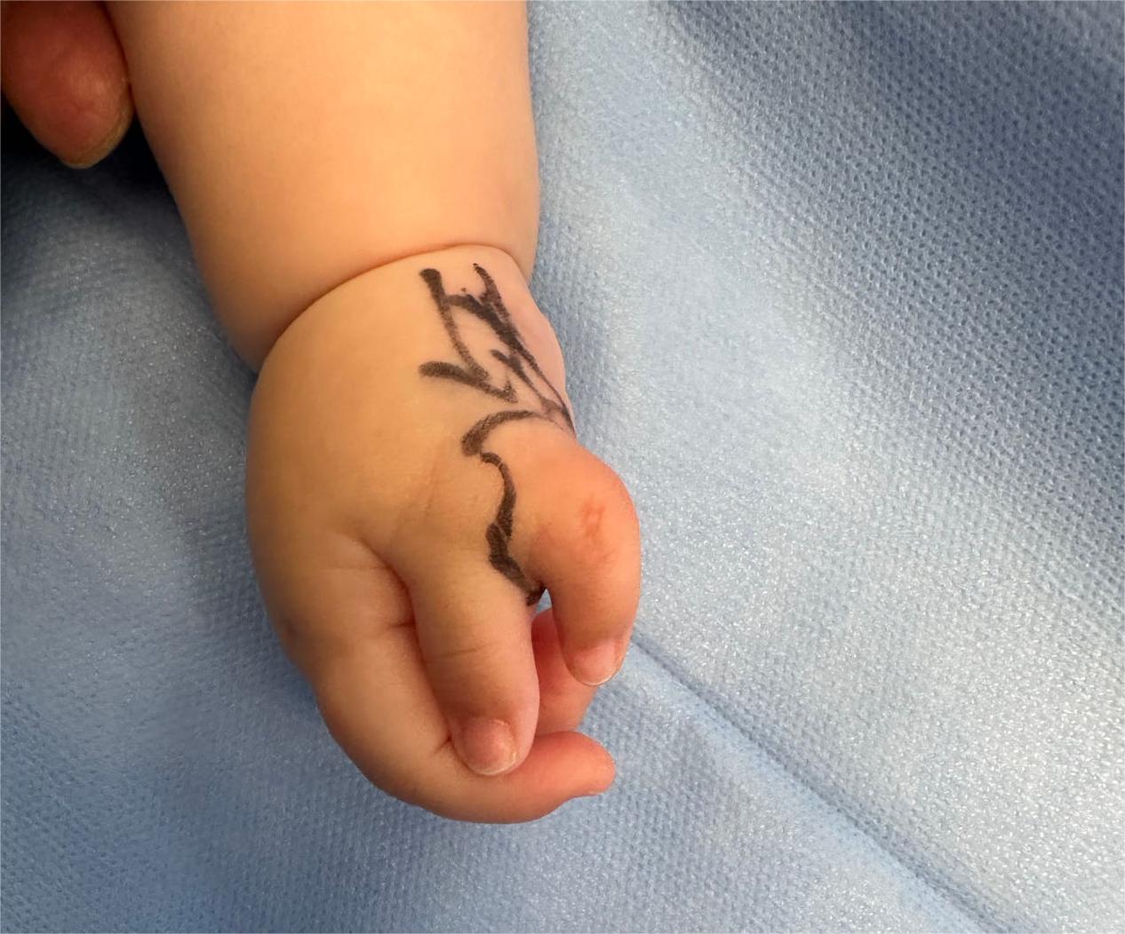来自外地的患儿小羽刚满5个月,在他出生后,就被发现其右手多了一个拇指,两个拇指并在一起,好似“蟹钳”,最终在医院被诊断为“多指畸形”。