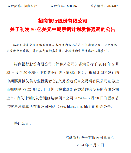 东方资讯消息,7月2日,招商银行发布公告,香港分行于2014年5月28日设立50亿美元中期票据计划。根据计划,拟发行的中期票据仅供专业投资者购买,并已在香港联合交易所上市。有关发售通函请参阅2024年6月28日刊登在香港交易及结算所有限公司网站的相关公告。