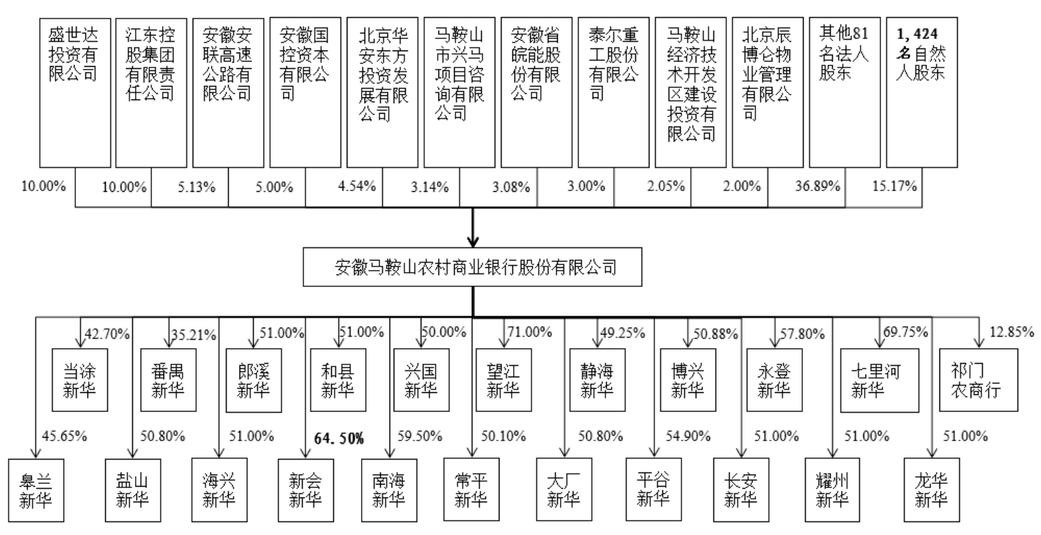 马鞍山农商行2023年9月披露的招股说明书显示,截至招股书签署日,马鞍山农商行的前5大股东为:盛世达投资有限公司(持股比例10%)、江东控股集团有限责任公司(持股比例10%)、安徽安联高速公路有限公司(持股比例5.13%)、安徽国控资本有限公司(持股比例5%)、北京华安东方投资发展有限公司(持股比例4.54%)。