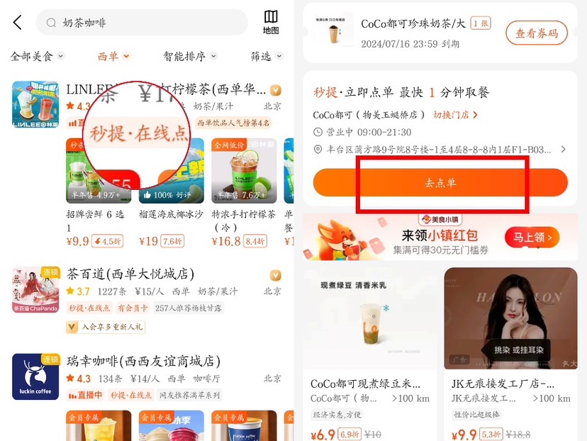 据悉,无论堂食还是外带,在App上,选择“秒提店”下单的美食团购,可在订单页点击“去点单”,一站式在线完成附近门店的验券、点单和后台自提预约,到店凭取单码取餐。省去了跳转品牌小程序或者人工验券的繁琐,“秒提”不仅能让消费者获得更好的购物体验,还能帮他们减少店内等待时间、轻松取餐。 “秒提店并不局限于茶饮、咖啡,未来还将在更多餐饮业态中复制,与外卖、堂食形成服务互补,以便更好满足线上、线下、到店以及出行过程中各种“多快好省”需求,进而激发新的餐饮消费活力,助力餐饮业提质升级,”美团到店餐饮相关负责人表示。 快节奏生活下,消费者更愿意为便利买单。试点运营期间,“到店秒提”这一即时消费模式获得市场积极反馈。以CoCo都可为例,开通“秒提”后,“提前点单、到店秒提”的顾客已从四分之一扩大至三分之二。 此外,“秒提”还改善了服务体验,也提高了门店生意和效率。在20平米的柠季门店中,人工核销一单团购需要至少2-3分钟,应用“秒提”功能后,门店的效率得到大大的提升。