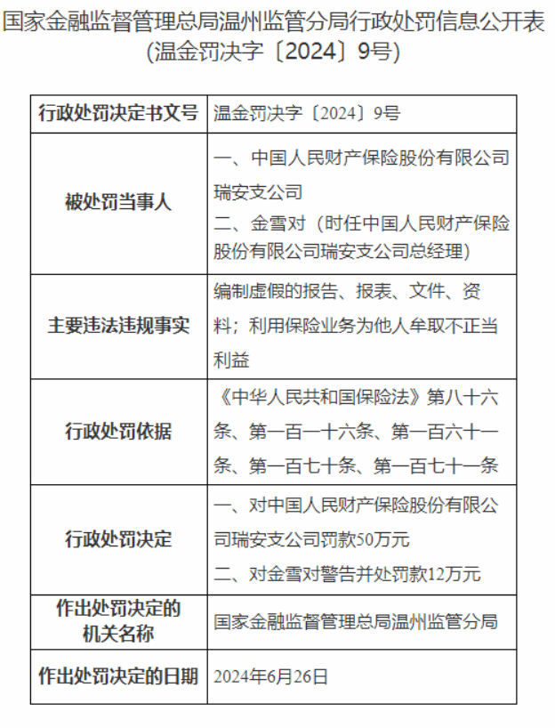 因对上述事项负有责任,对时任瑞安支公司总经理金雪对进行警告并处罚款12万元处罚。