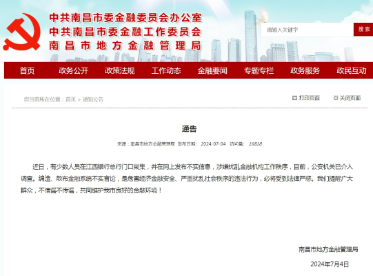 南昌地方金融局最新通告:涉事江西银行人员,公安机关已介入调查