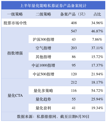 指数增强产品最受青睐。近年来,A股市场一直维持在底部震荡,指数增强产品的性价比凸显。私募排排网数据显示,上半年合计备案指数增强产品547只,占到备案量化产品总量的46.87%。而指数增强产品中,空气指增最受市场青睐,上半年备案产品数量为203只,占到指数增强产品总量的37.11%。沪深300指数虽然上半年表现最为出色,但似乎沪深300指增产品并不受市场待见,上半年合计备案43只产品,占到备案量化产品总量的7.86%,估计跟沪深300指数获取超额收益的难度较大有关。上半年备案的量化CTA产品中,则主要以量化多策略为主,上半年备案产品116只,占到备案量化CTA产品总量的54.72%。主要是量化多策略通过多种策略组合,能够形成互补,有助于提升产品净值的稳定性。