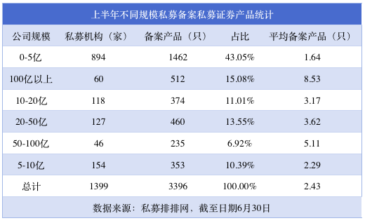 从不同规模来看,上半年备案产品近半数来自小规模私募。私募排排网数据显示,894家0-5亿元规模私募上半年合计备案私募产品1462只,占到备案产品总量的43.05%。但大规模私募备案产品更为积极,私募排排网数据显示,60家100亿元以上规模私募上半年合计备案私募产品512只,平均每家私募机构备案产品近9只,远高于其它规模组私募的平均备案水平。