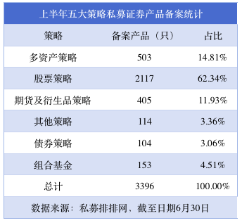 从不同投资策略来看,股票策略依然是上半年备案主力。私募排排网数据显示,上半年备案股票策略产品2117只,占到备案产品总量的62.34%;多资产策略和期货及衍生品策略作为小众策略中最受欢迎的策略,上半年分别备案产品503只和405只,占比依次为14.81%和11.93%;此外,虽然债券市场走出牛市行情,但是上半年仅备案104只债券策略产品,占比为3.06%,在五大策略中垫底。