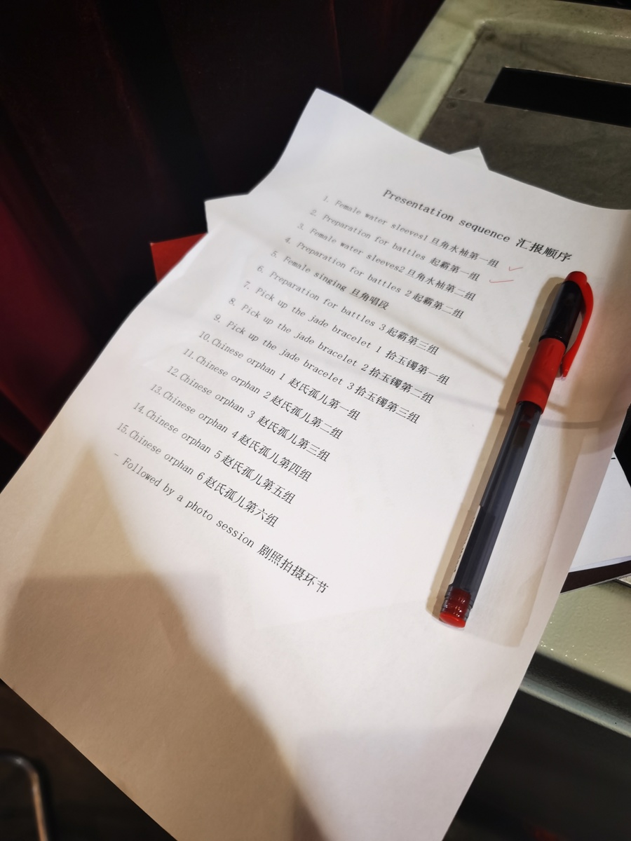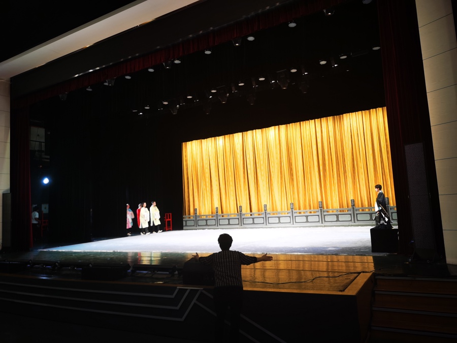 台上唱到“都道我老程婴贪图那富贵与赏金,卖友求荣害死了孤儿……”侧幕边的老师于翔坐不住,他走到舞台左下角,轻轻对台上比划“sit down,sit down”,演员缓缓坐下,于翔终于舒了一口气。
