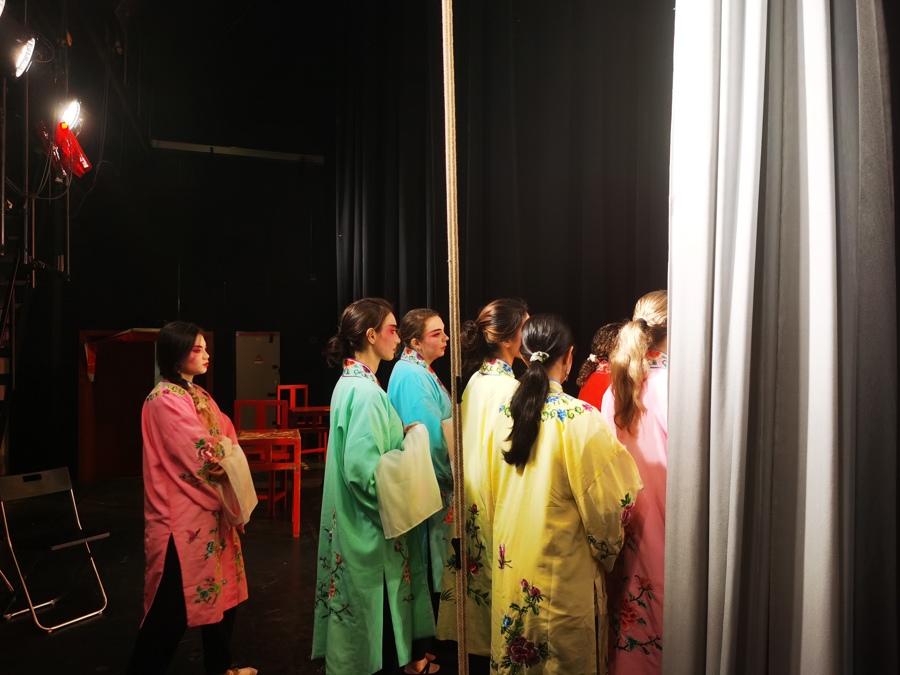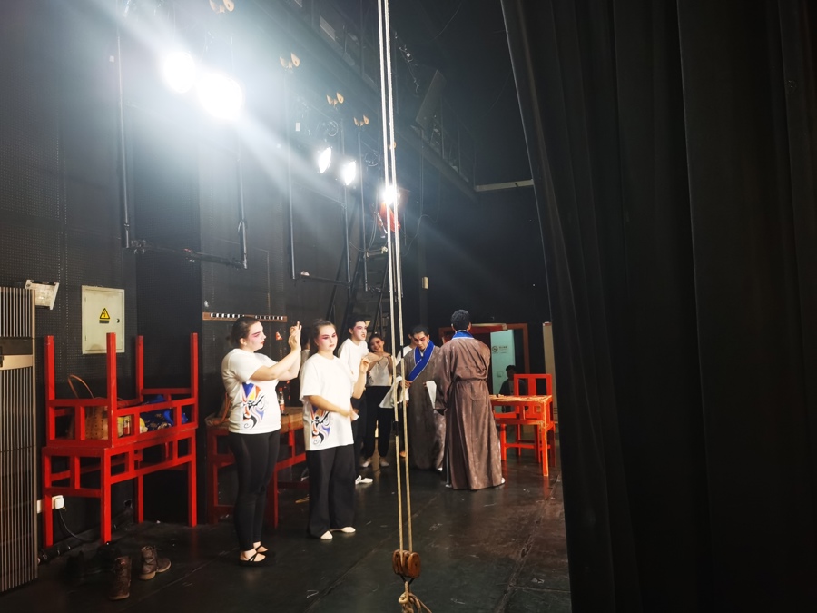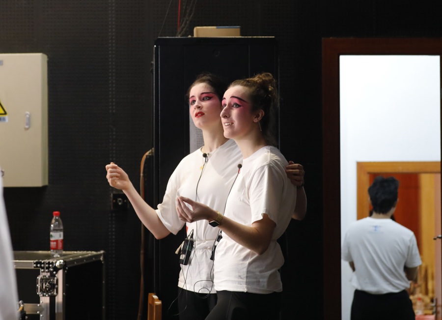 上戏国际交流中心项目负责人徐佳丽身兼汇报演出主持人。开场时,她让学生们放松,“今天自娱自乐,咱们就不拉大幕了,直接演。”演到半途,老师们还是坚持,要像正式演出一样拉上幕,再摆上《赵氏孤儿》桌椅。侧幕边,老师帮助大家整理戏服,哼着锣鼓点再做一遍示范,“腿抬得慢一点,再慢一点。”徐佳丽总结,“大家都特别认真,想让每一分钟都不留遗憾。”