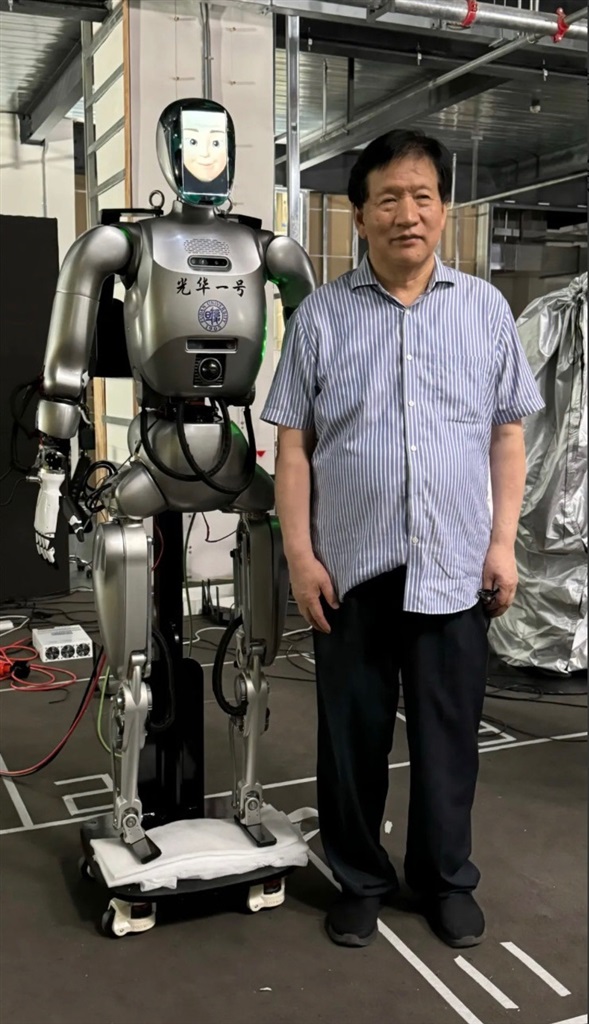 “如果用像木头一样毫无感情的机器人去给照顾老人,老人是体会不到类似亲人一样温暖的感觉的。只有具备情感功能,才能真正做好护理。”甘中学强调。 结合老年群体对于护理服务的情感诉求,团队进一步细化了研发方向,力图打造一款“行为要柔、情感要智、交互要亲、全息至善”的人形机器人。 会行走、有表情 这款机器人懂得你的“喜怒哀乐” 从外观上看,“光华一号”在外形上与人类相近,身高165cm,体重62kg,全身拥有45个变传动比的混联智能关节和层次化生成式具身大脑模型,以最小自由能原理驱控关节、躯体和全身,能够自如地摆动手臂和直立行走。 值得一提的是,团队不仅攻克了人形机器人的直立行走难题,还让“光华一号”还能在面部显示屏上做出喜、怒、哀、乐四种表情,让人在与之交互的过程中能够有更加直观的情感体验。