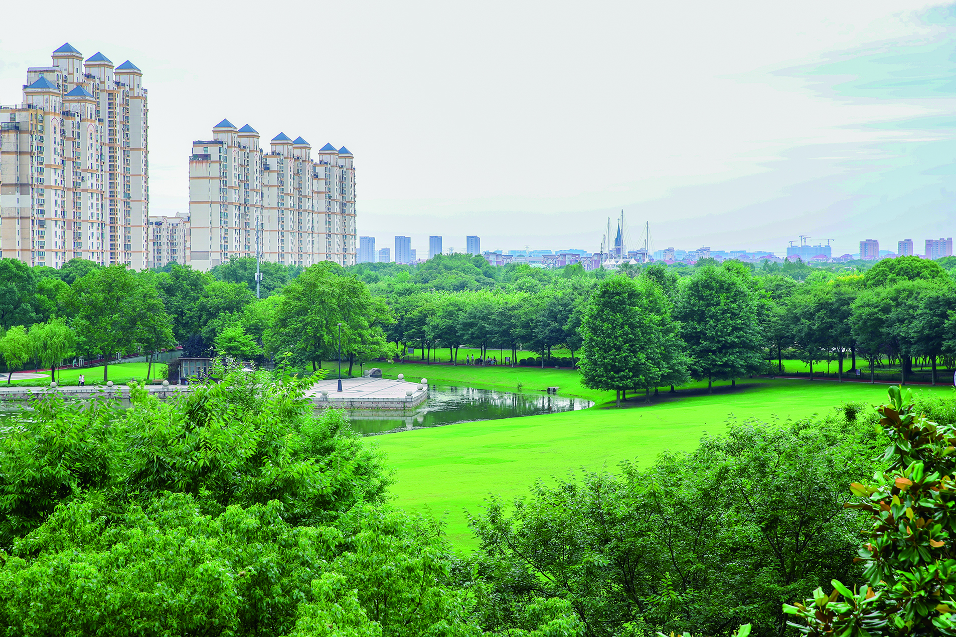 松江新城中央公园三期位于方松街道北翠路与江学路交叉路口附近,园内湖光树影、鸟语花香,是市民休闲娱乐、锻炼的好去处。走进绿地,只见一条狭长的健身步道沿湖蜿蜒,漫步其中,可以一路饱览沿途美景,郁郁葱葱的绿树与波光粼粼的水面共同组成一幅美丽的夏日画卷。图为中央公园一角。