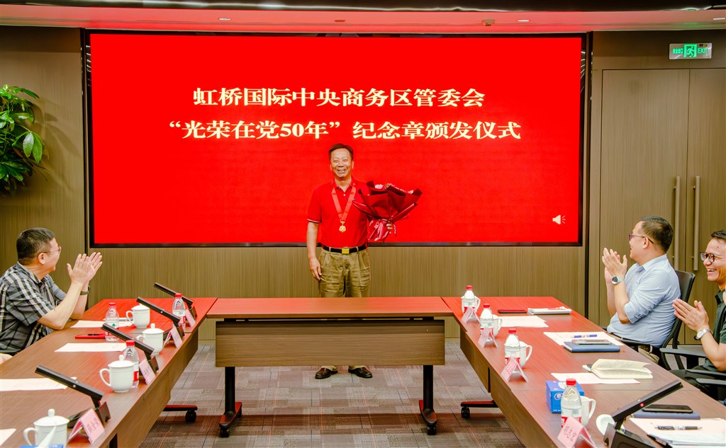 7月3日,虹桥国际中央商务区管委会党组召开庆祝中国共产党成立103周年座谈会,并举行“光荣在党50年”纪念章颁发仪式。管委会党组书记、常务副主任钟晓咏,管委会党组成员、副主任付乃恂、张斌、胡志宏,退休及在职党员干部代表参加。