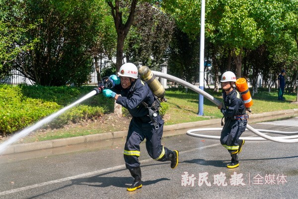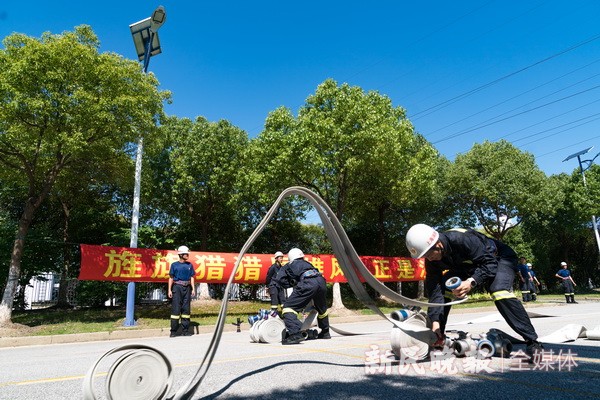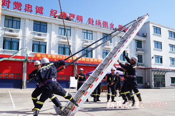 烈日炙烤,训练场地表温度持续升高,十五米金属拉梯经过数小时暴晒,表面已经发烫。随着裁判员发令枪声响起,四名消防员如离弦之箭快速出击,拉梯、竖梯、保护、爬梯分工明确,队员们互相配合,动作一气呵成。这是金山区消防救援局执勤岗位练兵交流会操现场发生的一幕。日前,金山区消防救援局组织开展执勤岗位练兵交流会操,7个消防救援站140余名队员,围绕百米铺设水带操、攀爬挂钩体操、九米拉梯吊升水枪操、攀登十五米金属拉梯操、枪炮协同灭火操5个项目展开激烈角逐。据了解,交流会操按照“以考促训、以练促战”的练兵机制,在精心做好防暑降温工作基础上,针对性组织实战化训练,在高温环境下锤炼消防救援人员综合素质的同时,进一步淬砺他们在处置突发事件时的适应能力。