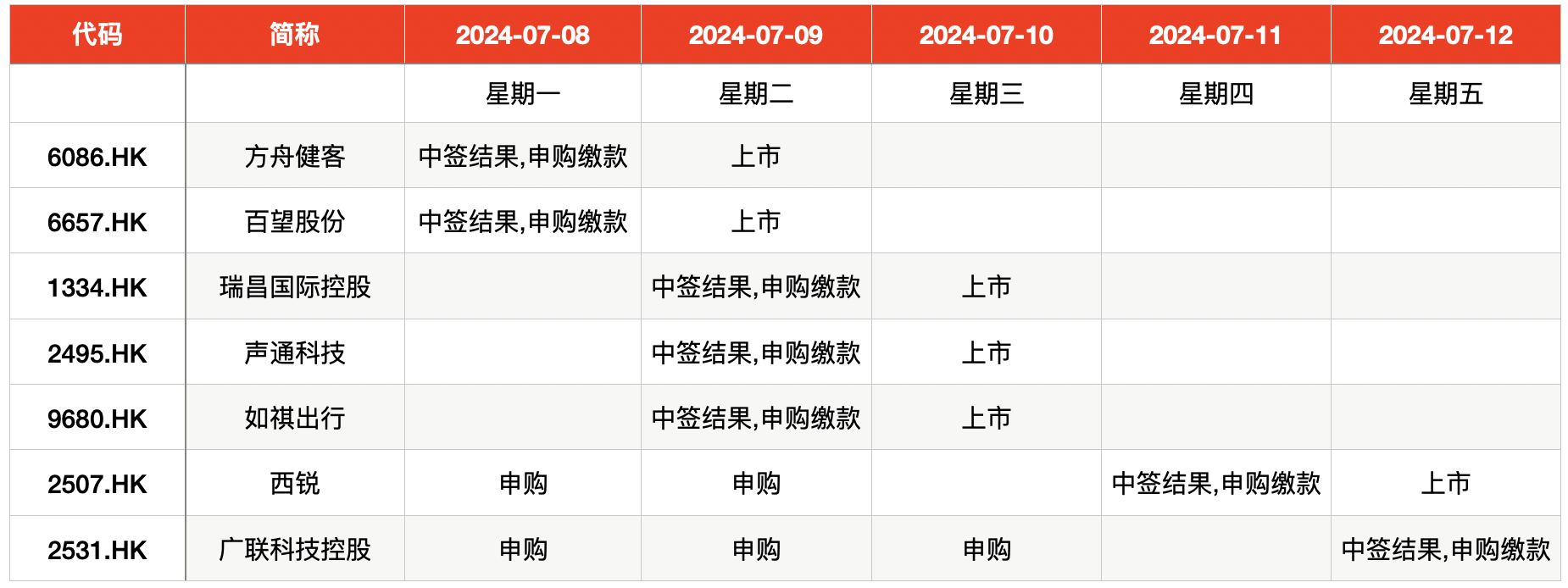 本周,港股共有5只新股上市。周二,方舟健客(06086.HK)、百望股份(06657.HK)上市;周三,瑞昌国际控股(01334.HK)、声通科技(02495.HK)、如祺出行(09680.HK)上市;周五,完成申购的西锐上市。