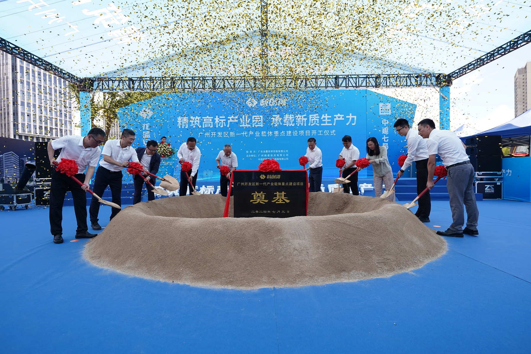 黄埔区工信局、广州开发区企业筹建服务局及联和街道办事处领导、龙盛安邦控股董事长钟良、中建七局六公司董事长司翔、汉森设计代表、华为集团代表等贵宾齐聚一堂,共同为这一新一代产业载体项目的开工奠基。