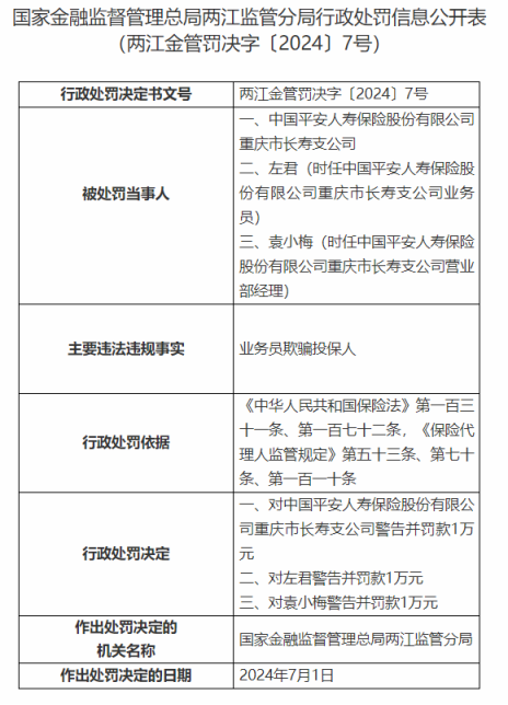 因业务员欺骗投保人,平安人寿重庆长寿支公司被罚1万元