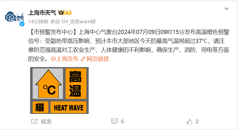 上海连续第六天发布高温橙色预警,明天起此轮高温将告一段落