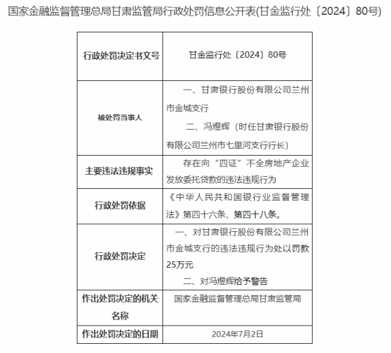 因向手续不全房企发放贷款,甘肃银行兰州市金城支行被罚25万元