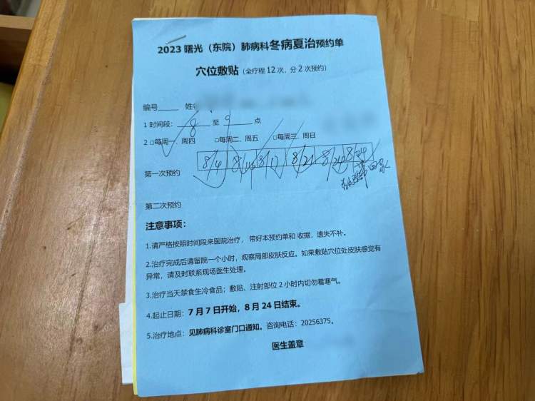 “我一到冬天就经常感冒咳嗽,听朋友说这里的三伏针很管用,所以今天来尝试一下。”在上海中医药大学附属曙光医院的“冬病夏治敷贴治疗点”前,一位女士刚刚完成三伏针的预约,正准备进行今年的第一次治疗。