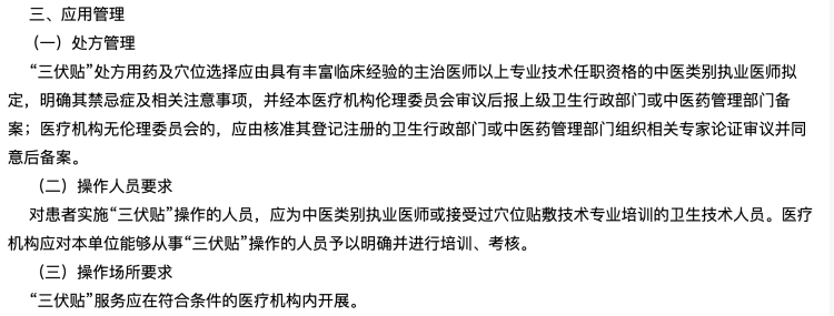 事实上,对于医院来说,三伏贴也不是想贴就贴。根据2013年《国家中医药管理局关于加强对冬病夏治穴位贴敷技术应用管理的通知》,国家中医药管理局对开展三伏贴的机构基本要求、处方管理、操作人员等都有着明确规定。
