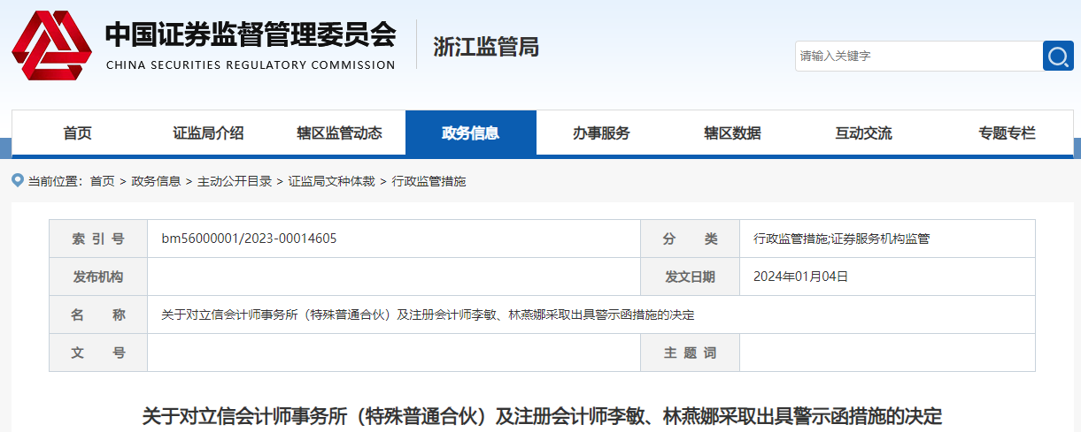按照相关规定,浙江证监局决定对立信所及注册会计师李敏、林燕娜分别采取出具警示函的监督管理措施,并记入证券期货市场诚信档案。