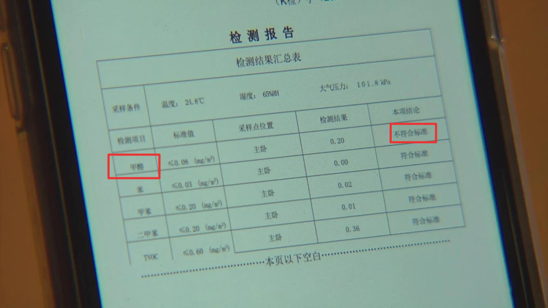 租客隋女士:我们看装修很新,床上的薄膜都还没有撕,我们就问二房东会不会有甲醛,他斩钉截铁地跟我们说没有,刚搬进来我的室友她就觉得呼吸困难,我们的检测结果也出来了,确实是甲醛超标,超了一倍多,两间房间都是超标的。甲醛超标我们要跟他协商退租。但是二房东还是不承认。