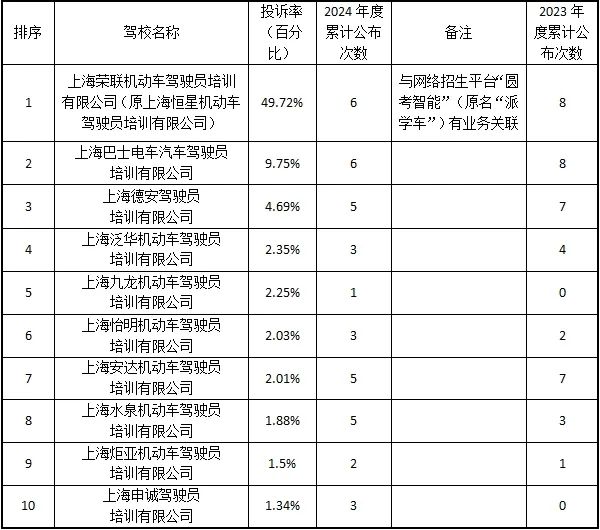 经统计,以下10家驾校2024年6月份投诉率排序靠前。