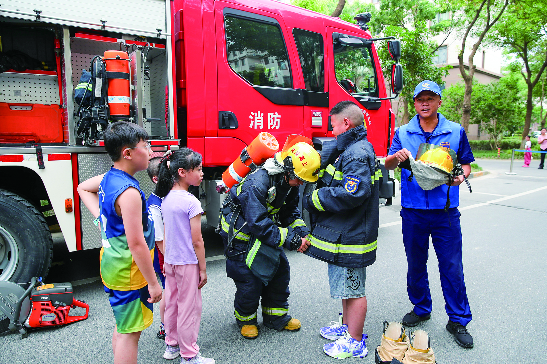 活动现场,消防员向小朋友们科普了消防安全知识。“如何使用灭火器?如何正确逃生?当遇到火情,应及时拨打119电话。”消防员郑斌现场讲解了一系列关于火灾逃生的安全技能。为了更好地传递消防知识,消防员还带领小朋友们参观了消防车、了解消防车的构成及设备器材的使用(见右图)。随后,翔禧物业安保人员还现场模拟消防演习,只见他们提起灭火器,拔掉保险销,握住喷管最前端,往下按压阀门,对准火焰根部喷射,火势立即被扑灭,小朋友们也在震撼中连连鼓掌。“今天我第一次现场学习灭火器的使用方法,感觉很激动。”沈楷翔小朋友说。