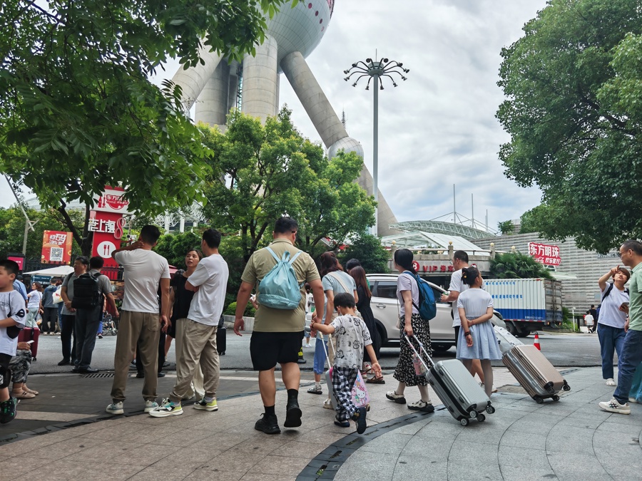 东方明珠塔下,不时可以看到拖着行李前来的游客。