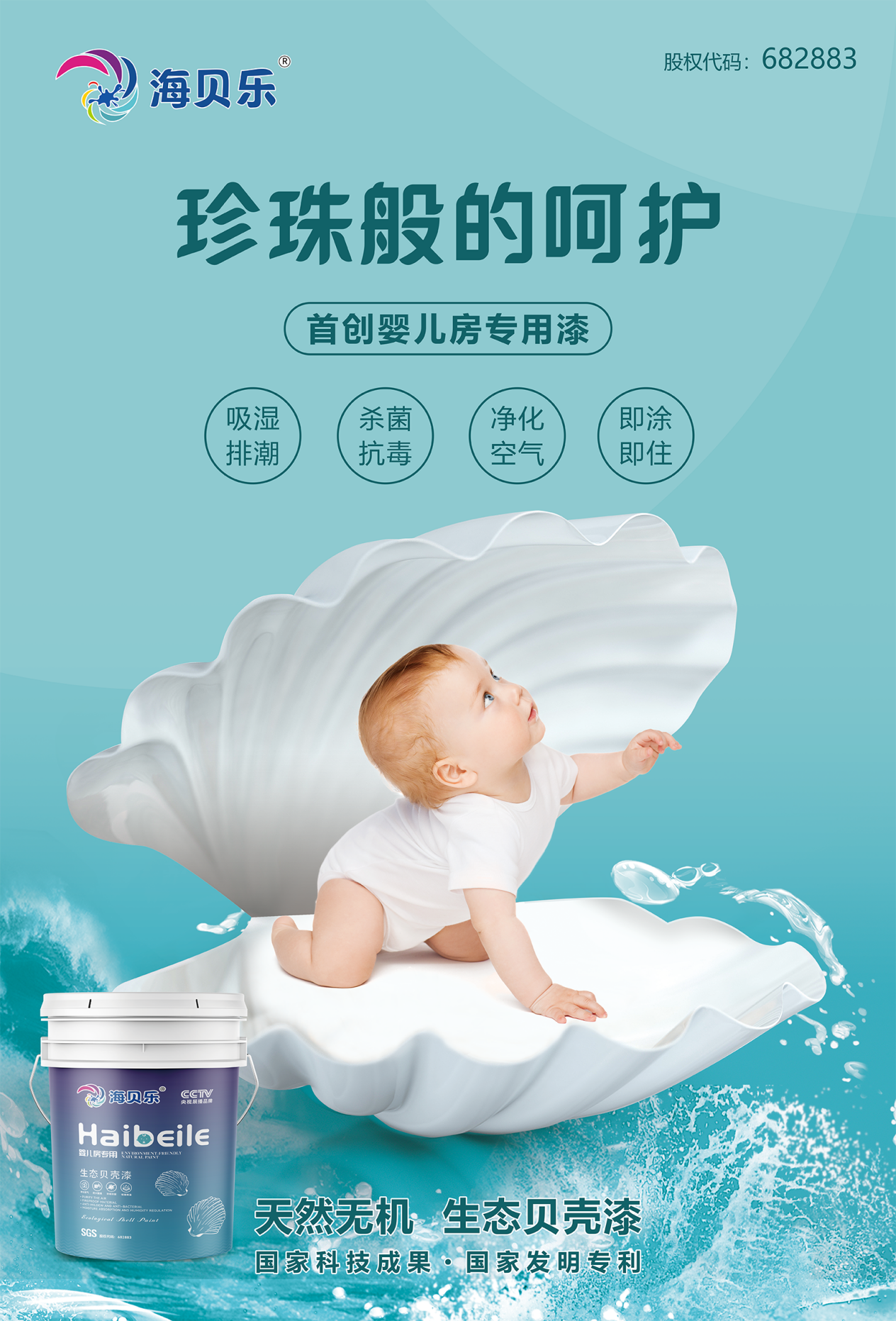 海贝乐无机生态贝壳漆,采用高温煅烧的贝壳灰为原料,产品呈膏体状,专利技术,解决了煅烧贝壳粉(氢氧化钙)制漆很快沉淀、分水、硬坨的世界性技术难题,仅使用清水粘合,不添加有机粘合剂。经法国A+认证和SGS瑞士认证,甲醛、VOC、重金属等各项污染指标均为零,杀菌率高达99.99%,真正做到无甲醛无毒无刺激。同时,海贝乐无机生态贝壳漆作为全世界唯一一款具有婴儿房资质的专用漆品牌,具有复合型的专业功效,可净化空气、杀菌抗毒、强力吸潮,防火阻燃(A1级别),并且耐候性强、长效耐久、无惧水洗和酸碱腐蚀。