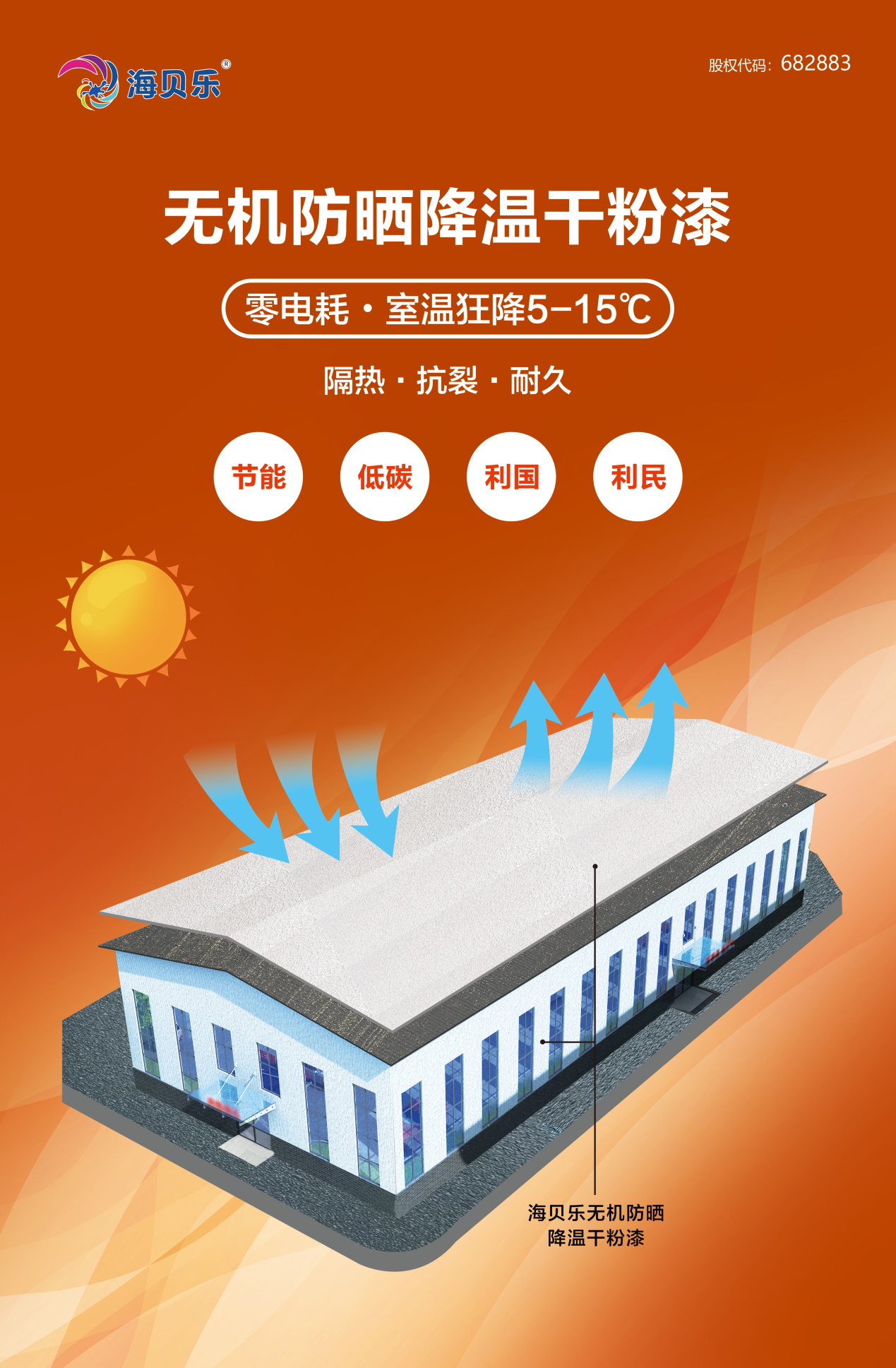 海贝乐无机防晒降温干粉漆,以质轻降温耐火的无机胶凝矿粉为主材,外加纳米增强剂、高分子聚合物等组成,可实现0电耗室内狂降5-15摄氏度!降温工作原理为:在建筑体表面形成连续性的柔韧性无机涂膜,进而通过“辐射+反射冷却”工作流程,利用特定波长的红外辐射直接将热量反射及辐射到太空。由于原料为纯无机,因而海贝乐无机防晒降温干粉漆不含甲醛、VOC,同时具有A1级防火性能,在生产、施工、火灾中均无毒无烟无污染,也无挥发性有害气体;更具有强耐候性,抗碱、耐水、耐盐雾,附着力强、抗压强度高、刚柔相济、可弯折180度不开裂,耐洗刷性2000次涂膜无损,不但使建筑体表面和内部在烈日下降温清凉;而且抗裂防水、抗霉抗老化、不吸附灰尘,整体无缝,使用寿命长达10年以上。