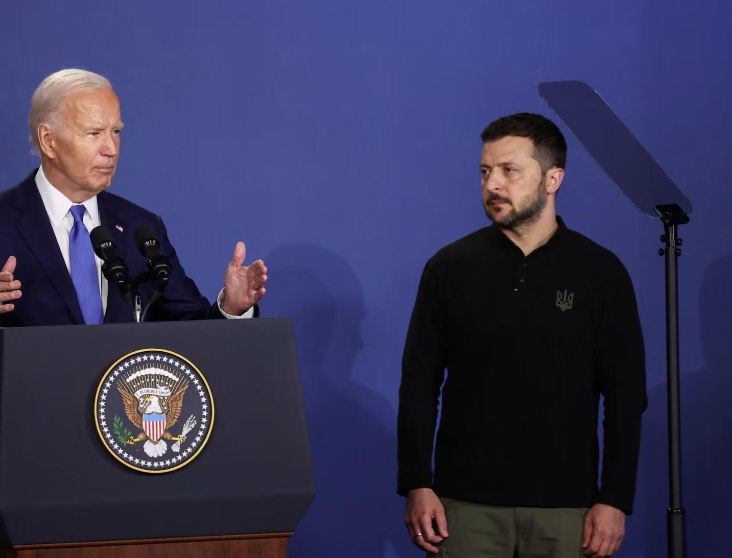 当地时间7月11日,北约华盛顿峰会期间,泽连斯基听拜登讲话。路透社