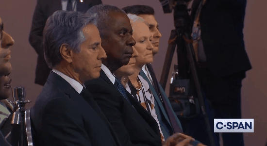 视频画面显示,拜登作出这番发言的同时,其坐在台下的多名内阁成员也是一脸“生无可恋”——国务卿布林肯低着头若有所思,国防部长奥斯汀一脸凝重,总统国家安全事务助理沙利文也不禁拿手托着下巴沉思。