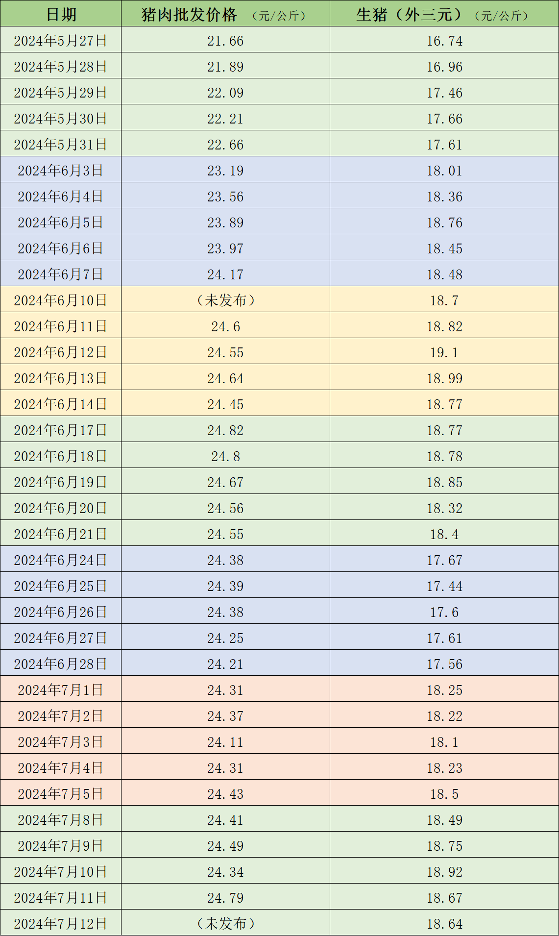 本周国内生猪价格先涨后跌,周均价环比上涨。据中国养猪网的数据,7月12日,生猪(外三元)价格为18.64元/公斤,与上周五(7月5日)的18.5元/公斤相比,上涨0.8%。从一周均价来看,本周生猪均价为18.7元/公斤,与上周18.26元/公斤的均价相比,上涨2.4%。