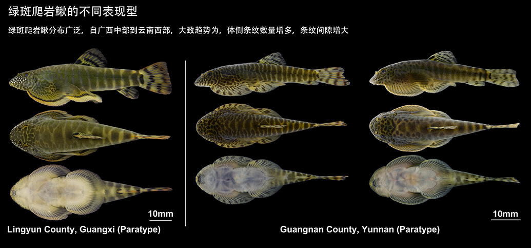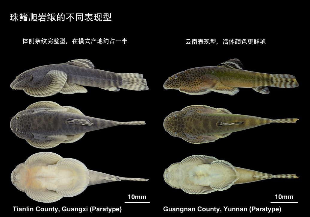 在调查“绿斑马”其他栖息地的过程中,团队发现,在云南和广西交界的地区,生活着一群形态类似秉氏爬岩鳅的鱼类,但它们的胸鳍上有一串串“珍珠”一样的颗粒,而其他地区的种群并没有这一特征。仔细观察后发现,这些种群尾柄较为短粗,胸腹鳍形成的“吸盘”较小。