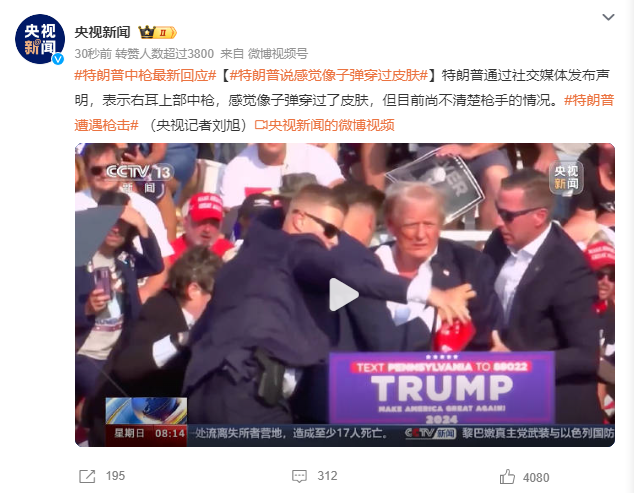 特朗普通过社交媒体发布声明:感觉像子弹穿过了皮肤