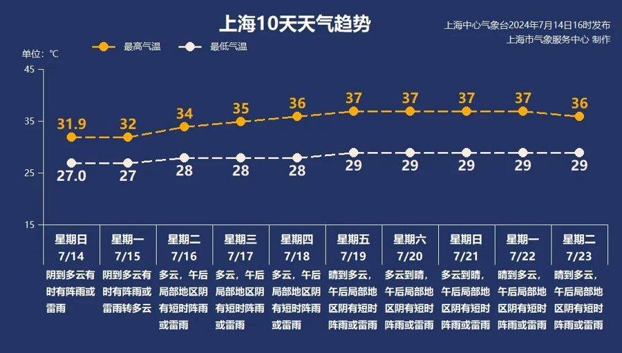 上海中心气象台预报,今起7天,申城最高温在35℃上下浮动,极端最高温会超过37℃,不仅白天热,夜温也接近30℃。