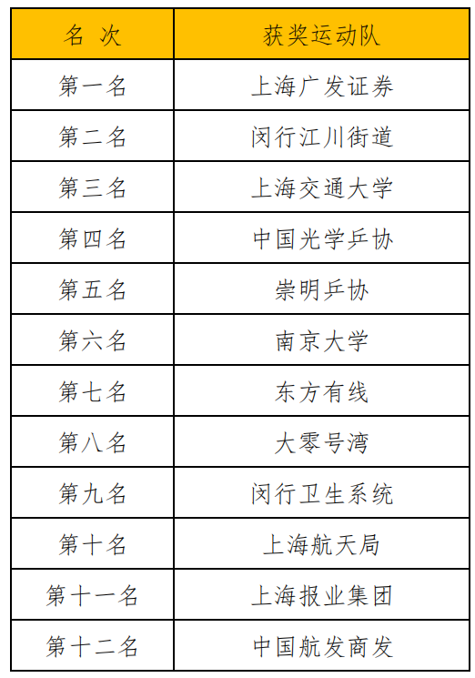 经过两个阶段的激烈比赛,上海广发证券代表队获得冠军,闵行江川街道代表队获得亚军,上海交通大学代表队获得季军。